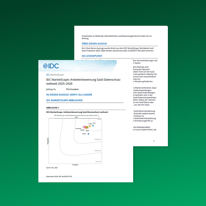 Während Organisationen die Einführung von SaaS beschleunigen, reichen native Schutztools und allgemeine Backup-Plattformen häufig nicht aus. Der IDC MarketScape bewertet Anbieter in diesem Markt und zeigt auf, wie speziell entwickelte SaaS-Datenschutzplattformen den wachsenden Herausforderungen in den Bereichen Cyber-Resilienz, Compliance und Wiederherstellung begegnen. Der hervorgehobene Auszug erläutert, warum Keepit ausgezeichnet wurde und in welchen Bereichen unsere Fähigkeiten den heutigen — und zukünftigen — Anforderungen der Käufer entsprechen.