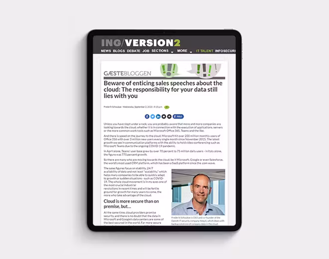You should ask the exact same questions when you consider cloud platforms. Microsoft, for instance, offers 99.9 percent uptime and the highest physical and digital security level in the world. But when that 0.01 happens, and you cannot access data critical to your organization, no one will help you. Or even worse: If you lose data due to e.g. a hacker attack or accidental data deletion, Microsoft will not be able to provide you with an updated backup copy of your data.