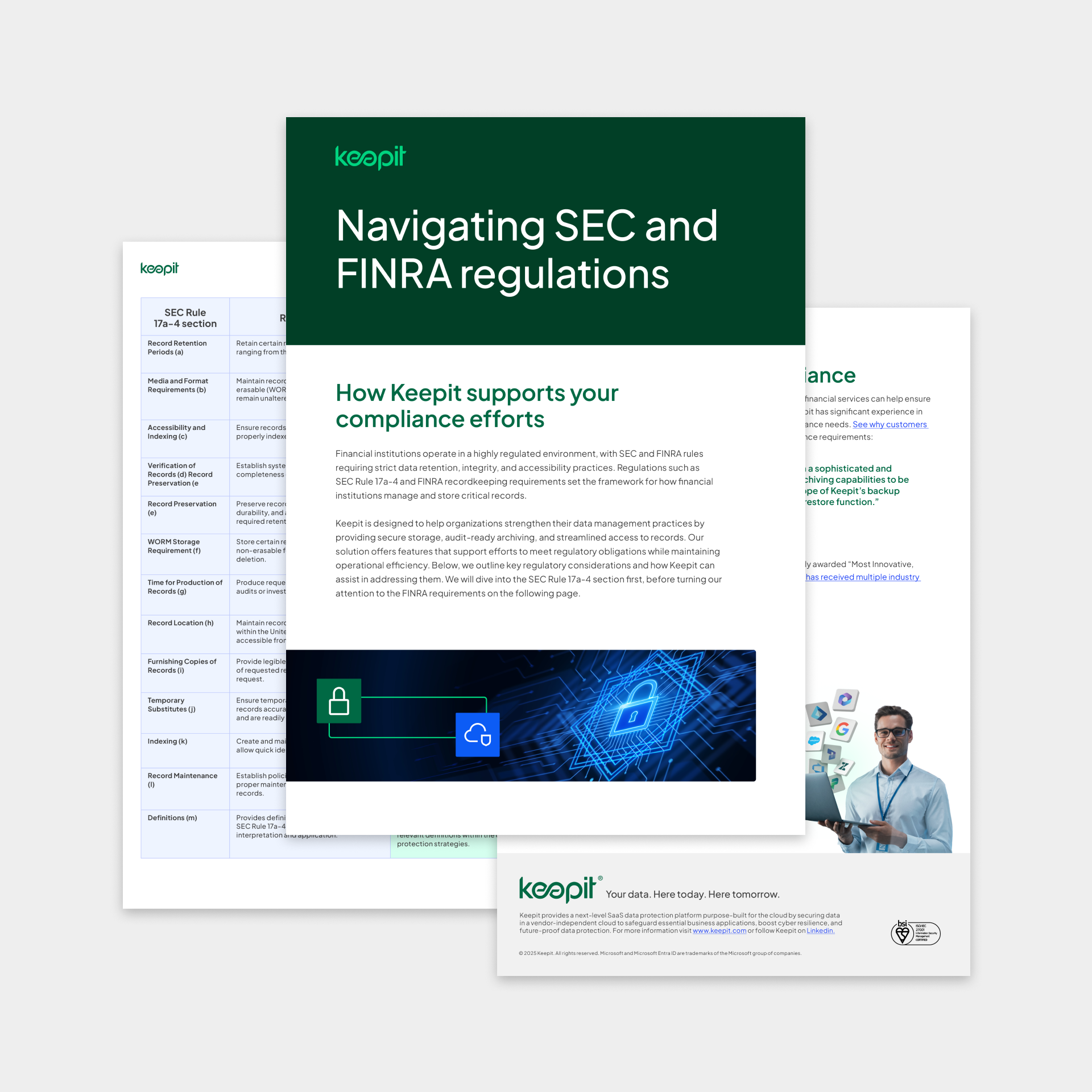 This factsheet provides a detailed overview of how Keepit helps address the requirements of SEC Rule 17a-4 and key FINRA rules. It explains how our purpose-built, independent SaaS data protection platform supports immutable, long-term storage of data in a non-rewritable, non-erasable format, enables efficient recovery, and contributes to your overall business continuity planning.